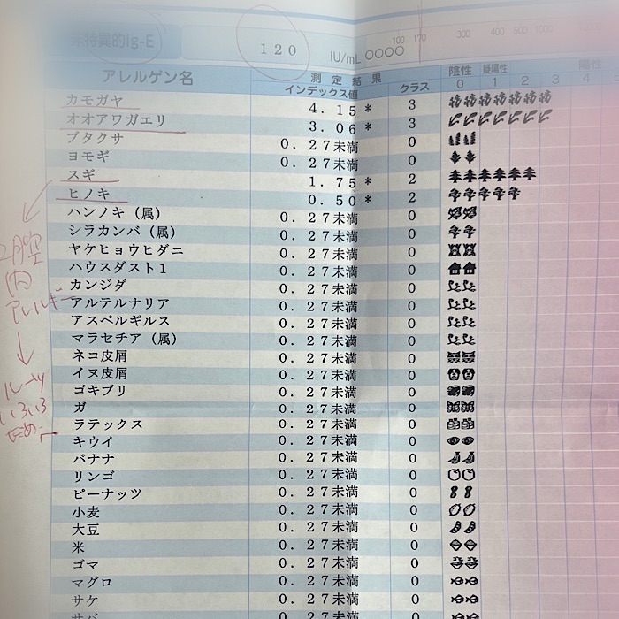 今回検査して出た結果は、花粉症はあるものの、アレルギー反応の結果としてはかなり弱い方だと。。。